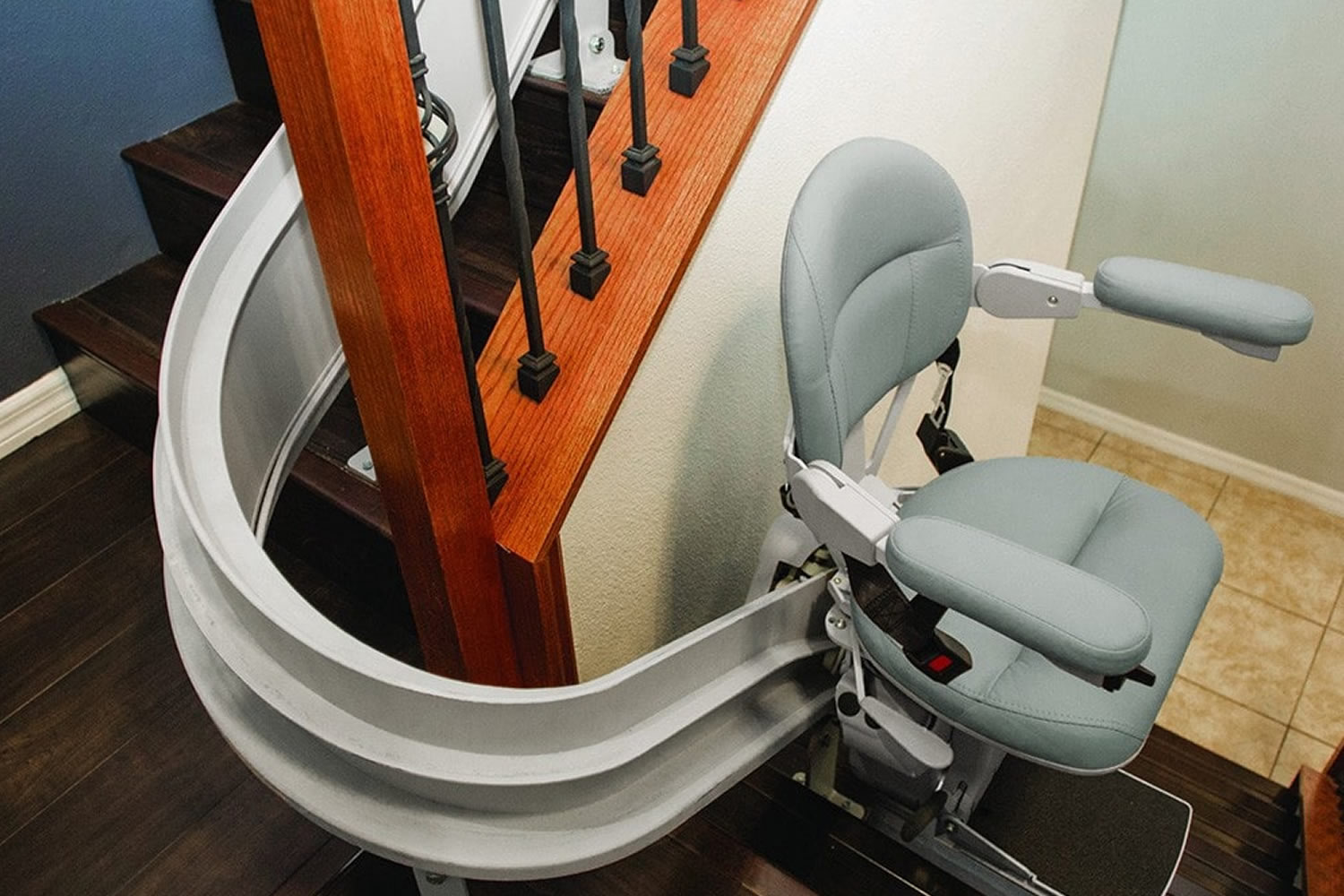 A a customizable stairlift, designed for stairs that turn. Curved stairlifts can be installed on all sorts of stair configurations, ranging from simple 90° turns, all the way to long spiral staircases. Curved stairlift rails are custom-made to fit the unique shape of your stairs, while the seat comes with additional features and options to make operation even easier.